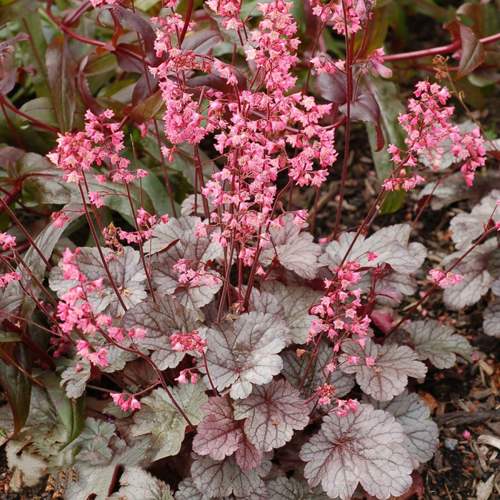 Гейхера "Милан" радует ранним цветением: её небольшие соцветия-метёлки расцветают с мая и продолжают цвести до сентября, наполняя сад насыщенно-розовыми оттенками. Этот период цветения привносит яркие акценты и оживляет окружающее пространство, благодаря чему гейхера прекрасно подходит для создания выразительных цветочных ковер.