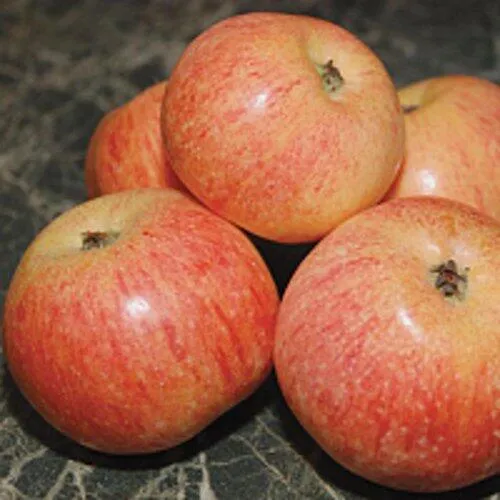 - Плоды — яблоки 80–120 г, с желтой кожицей и розовым румянцем, сочной белой мякотью и сладким ароматом. Подходят для употребления в свежем виде и добавления в десерты.